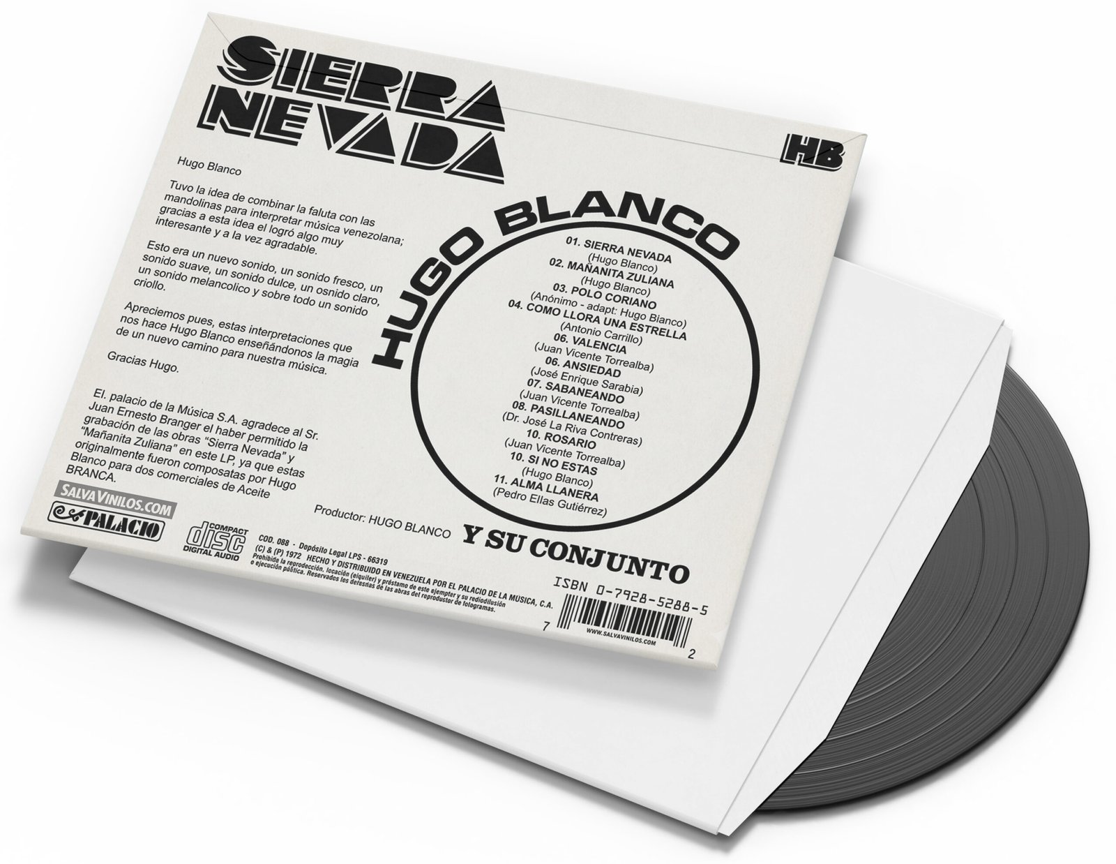 Este es un disco icónico del maestro Hugo Blanco, titulado “Sierra Nevada”. Fue lanzado originalmente en 1972 por el sello El Palacio de la Música y representa un momento fascinante en la evolución de su estilo. La imagen muestra a Hugo Blanco con su tradicional poncho amarillo y su cuatro, contrastado con una fotografía de los picos nevados de los Andes venezolanos. Es una pieza de colección muy buscada por los amantes del vinilo, especialmente por aquellos que valoran el sonido de los conjuntos de finales de los 60 y principios de los 70.