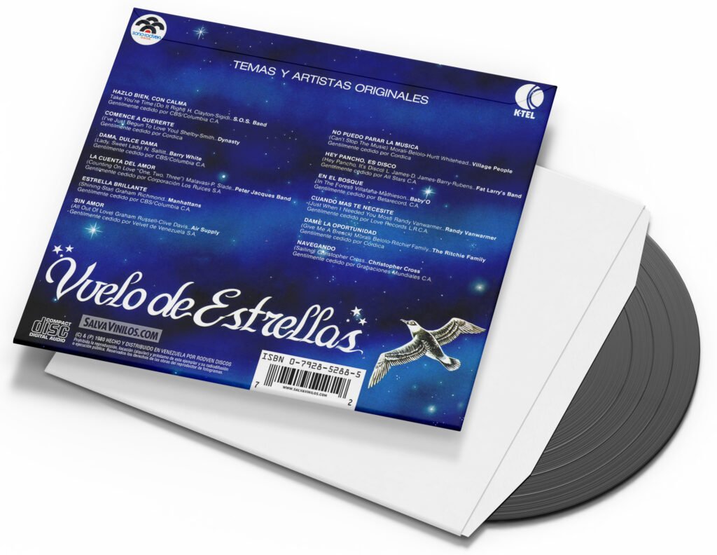 “Vuelo De Estrellas” es un álbum recopilatorio de vinilo (LP) tipo compilación lanzado en Venezuela en 1980 por el sello Sono-Rodven (TV-283). Este disco presenta una mezcla de géneros pop, rock y disco, incluyendo éxitos de artistas internacionales como The S.O.S. Band, Village People, Air Supply, Fat Larry’s Band y Baby’O. Este álbum es un ejemplo de las recopilaciones de música internacional que eran populares en Venezuela bajo la promoción de canales de televisión o sellos locales, frecuentemente distribuidos por K-Tel en esa época.
